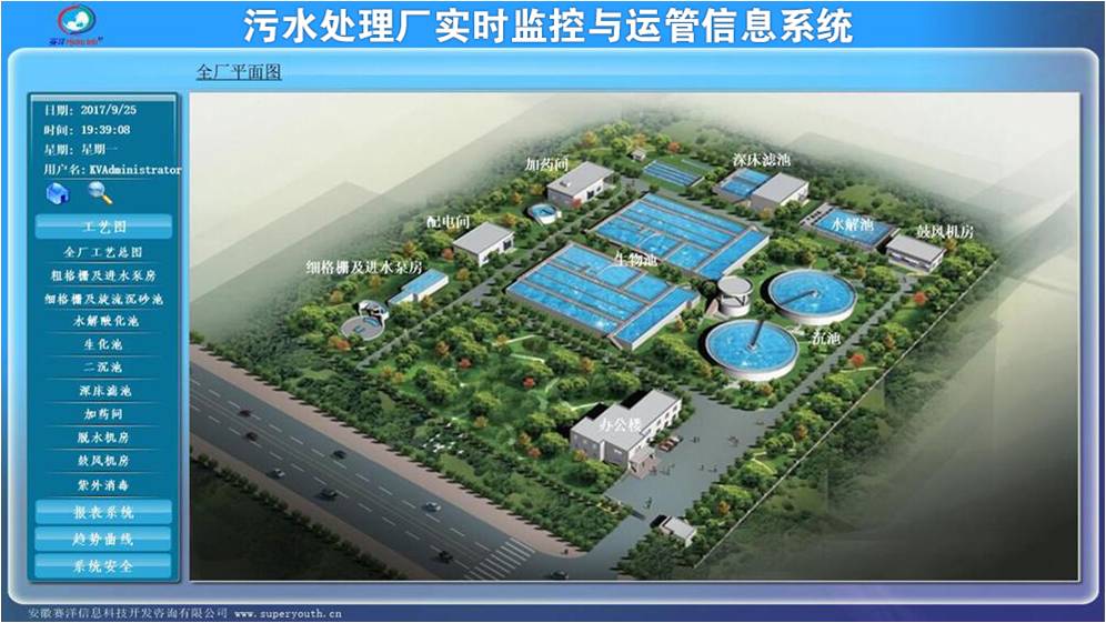 采用監(jiān)控組態(tài)軟件,實(shí)現(xiàn)對(duì)PLC、儀表等設(shè)備數(shù)據(jù)采集,以及對(duì)粗\細(xì)格柵電機(jī)、鼓風(fēng)機(jī)等設(shè)備的控制與管理。以美觀、友好的界面顯示進(jìn)出水在線儀表總氮、總磷、氨氮、COD、PH及各個(gè)工藝體分析儀表(溶解氧、污泥濃度、液位等)等數(shù)據(jù)采集及監(jiān)測(cè),并以曲線圖等多種方式清晰直觀的顯示各個(gè)敏感數(shù)據(jù),方便用戶(hù)對(duì)各敏感數(shù)據(jù)進(jìn)行歷史查詢(xún)和對(duì)比分析。系統(tǒng)具備多種報(bào)警功能。當(dāng)有報(bào)警產(chǎn)生時(shí),系統(tǒng)會(huì)有自動(dòng)彈出式報(bào)警窗口進(jìn)行閃爍報(bào)警,并同時(shí)配以聲音報(bào)警對(duì)用戶(hù)具有強(qiáng)烈警示作用。